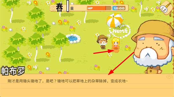 2、在戶外場景,跟隨角色指引了解鎬頭的用法,用鎬頭進行鋤地操作,可清除草地上的雜草,將草地改造為可耕種的農地。