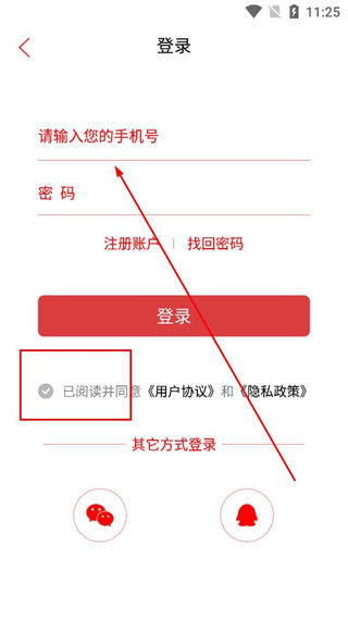 1、打開株洲新區軟件進入登錄頁面,輸入手機號和密碼,勾選已閱讀同意協議后,點擊登錄按鈕完成登錄。