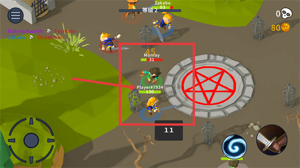 4、玩家操控角色在場景中與其他玩家交鋒,合理使用右邊的技能與普攻按鈕,不敵時也要靈活躲避,打敗所有對手即可獲得戰場勝利,玩具能獲得更多收益。