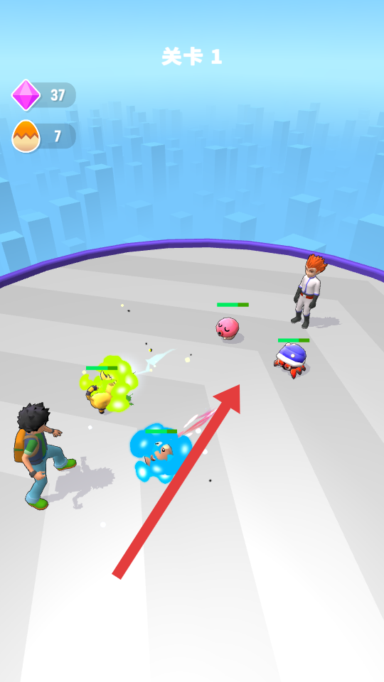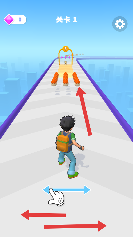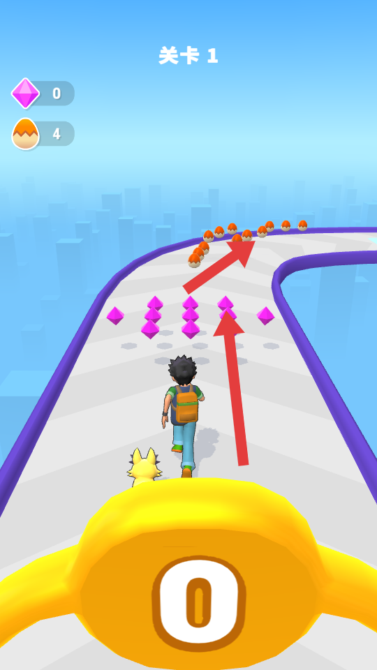 1、進入關卡1,操控角色在跑道上左右移動,朝著前方目標前進,同時可收集橙色的精靈球等物品。