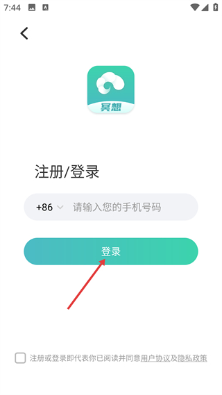 1、打開應用先進入注冊登錄界面,選擇+86區號后輸入手機號碼,勾選用戶協議及隱私政策,再點擊登錄按鈕,完成賬號的注冊或登錄操作。