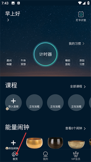2、進入應用首頁能看到計時器模塊,還有晨間喚醒午休冥想睡前放松等功能入口,底部有首頁我的VIP會員按鈕,可切換不同功能頁面。