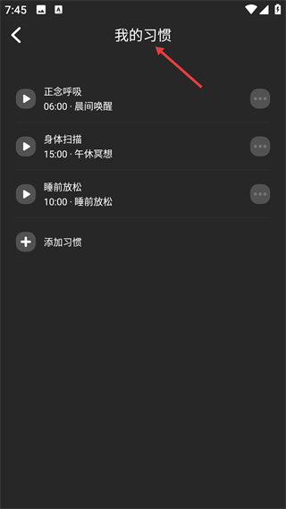 3、進入我的習慣頁面能看到正念呼吸身體掃描睡前放松等預設習慣,每個習慣標注時長和場景,還能點擊添加習慣自定義冥想安排。