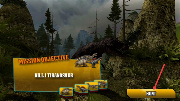 2、玩家進入任務場景,明確目標是擊殺1只霸王龍,場景中有霸王龍和其他恐龍,點擊HUNT正式開啟狩獵行動。