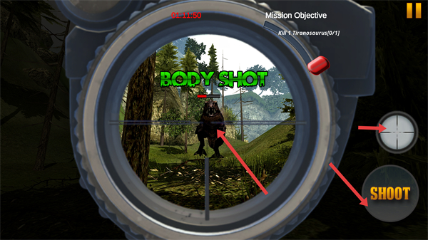 3、進入瞄準界面,通過瞄準鏡鎖定霸王龍,瞄準其頭或身體部位,利用右側瞄準和SHOOT射擊按鈕,精準射擊霸王龍。