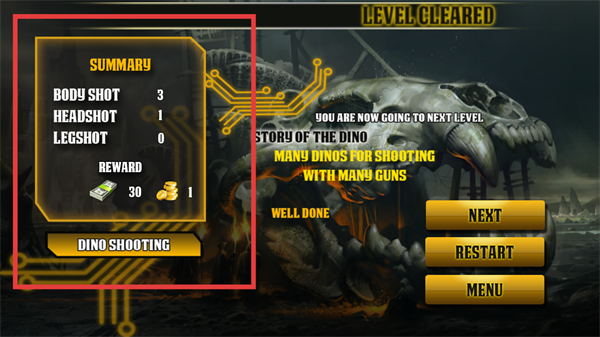 4、成功通關后查看結算界面,可知擊中3次身體、1次頭部,獲得美元和金幣獎勵,可點擊NEXT進入下一關。