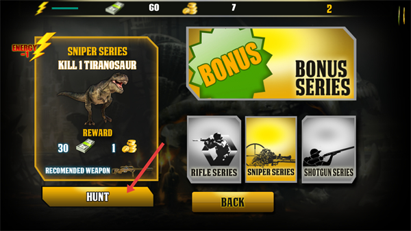 1、首先玩家先接取任務,看到需用狙擊槍系列武器擊殺1只霸王龍,獎勵美元、金幣,推薦使用狙擊槍,點擊HUNT開始狩獵。