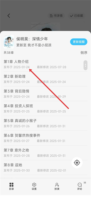 3、進入小說章節列表頁面,選擇感興趣的章節,如第1章人物介紹,點擊進入章節閱讀頁面。