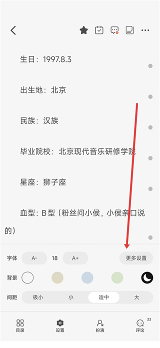 4、在章節閱讀頁面可查看章節內容,點擊更多設置,可調整字體、背景、間距等閱讀設置,優化閱讀體驗。