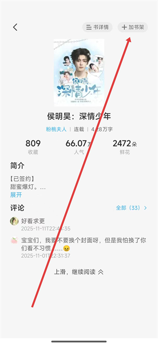 2、在小說詳情頁面,點擊加書架,將小說加入書架,方便后續閱讀。