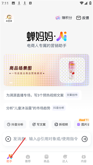 1、助手頁未登錄狀態,有蟬媽媽AI電商營銷助手標識,提供商品場景圖創作、文案創作等功能,底部有助手等功能入口。