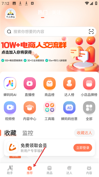 2、推薦頁有搜索欄,10W電商人交流群banner,展蟬媽媽AI、直播榜等功能入口,還有收藏監控板塊及免費領會員入口。