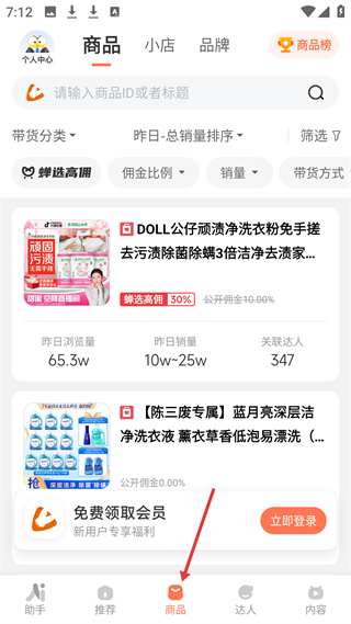 3、商品頁可搜商品ID標題,按分類銷量篩選,展DOLL洗衣粉、藍月亮洗衣液等,標注傭金、銷量和關聯達人。