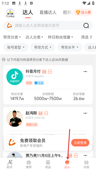 4、達人頁可搜達人名稱抖音號,按分類篩選,展抖音月付、趙鴻剛等達人,標注粉絲量、銷售額和粉絲增量。