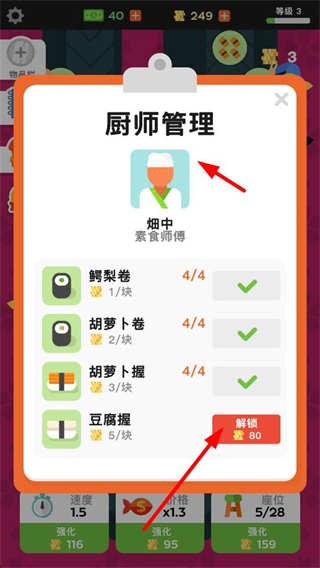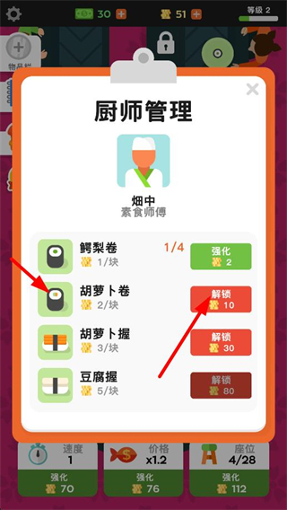 1、進入廚師管理界面,消耗金幣解鎖新的菜品,比如胡蘿卜握,豐富廚師可加工的食材類型,提升收益渠道。