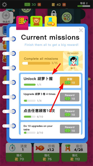 2、完成解鎖胡蘿卜握任務后點擊獲取按鈕,領取金幣獎勵,同時推進總任務進度,朝著完成所有任務的目標前進。