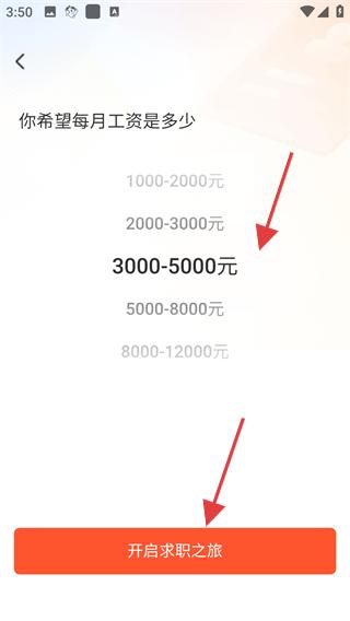 4、在期望薪資頁面選擇自己希望的每月工資范圍,如3000到5000元等,選擇后點擊開啟求職之旅按鈕,正式進入求職流程,開始尋找合適的工作機會。
