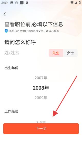 1、進入信息填寫頁面,首先填寫個人基本信息,包括姓名、性別、出生年份和工作經驗,填寫完成后點擊下一步按鈕。