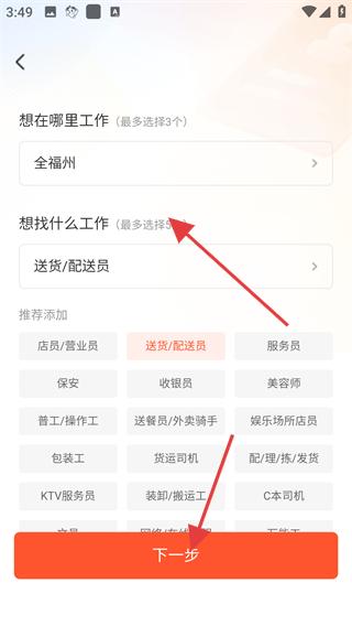 3、在求職意向頁面選擇工作地點和想要找的工作類型,如送貨,配送員等,可根據推薦添加其他感興趣的崗位,選擇完成后點擊下一步按鈕。