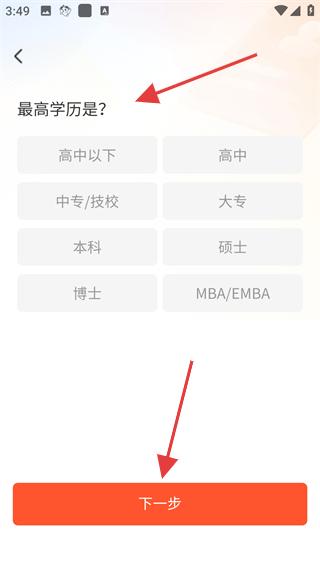 2、在學歷選擇頁面選擇自己的最高學歷,如高中、大專、本科等,選擇后點擊下一步按鈕。