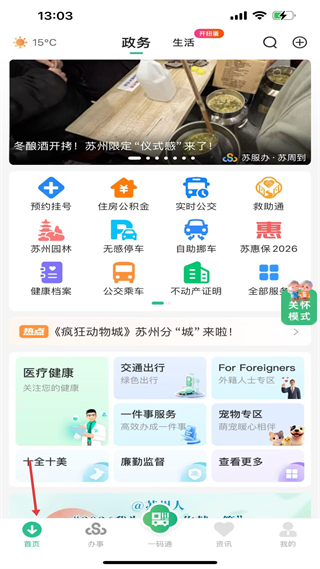 2、首頁,整合預約掛號等政務服務,分場景展示醫療交通等板塊,是蘇州本地政務與生活服務的核心聚合頁。