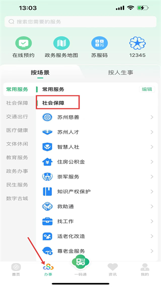 3、辦事頁,按場景分類展示社會保障等服務板塊,可快速定位所需政務服務,助力市民提升辦事效率。