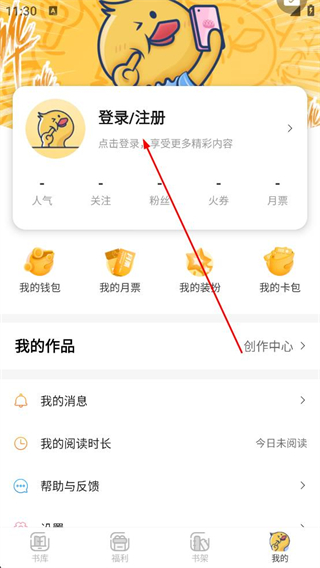 1、在書架頁面,若想查看閱讀歷史,點擊右上角的時鐘圖標即可。頁面還提示不登錄將無法進行收藏操作,可點擊快點戳我登錄吧完成登錄。