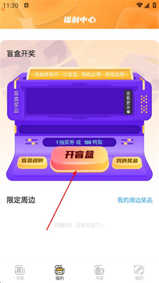 3、登錄后點擊福利選項,進入福利中心頁面,可參與盲盒開獎活動,點擊開盲盒按鈕抽取獎品。