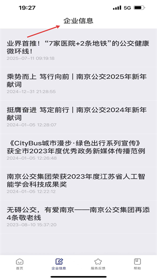 2、企業信息界面,展南京公交集團動態,如推健康微環線、新年獻詞、獲新媒體獎、新增敬老線等,讓用戶了解企業服務。