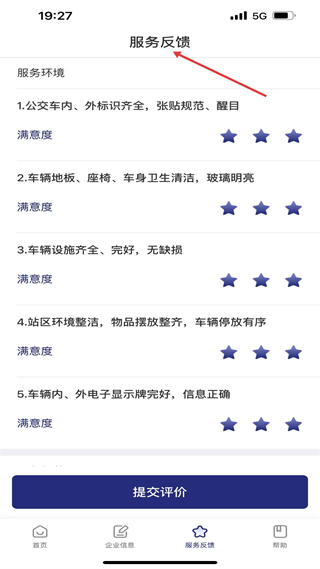 3、服務反饋界面,設服務環境滿意度評價項,涵蓋公交標識、車輛衛生、設施等,用戶可評星提交,助力企業優化服務。