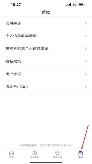 4、幫助界面,提供使用手冊等查詢入口,顯示版本號和ICP備案,為用戶使用APP和了解權益提供指引。
