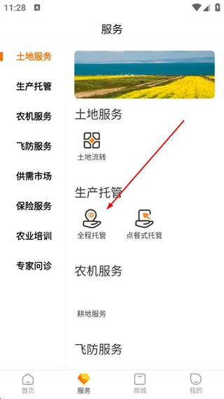 3、進入服務頁面選擇生產托管分類,可查看全程托管點餐式托管等服務類型,結合自身需求選擇對應的托管方式,獲取農業生產的托管支持。