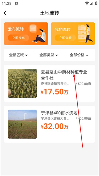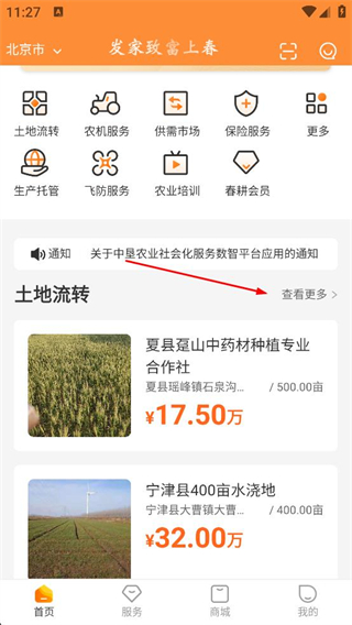 1、打開軟件進入首頁,可查看土地流轉農機服務等功能入口,瀏覽土地流轉板塊的信息,查看不同地塊的面積和價格,點擊查看更多了解詳細內容。