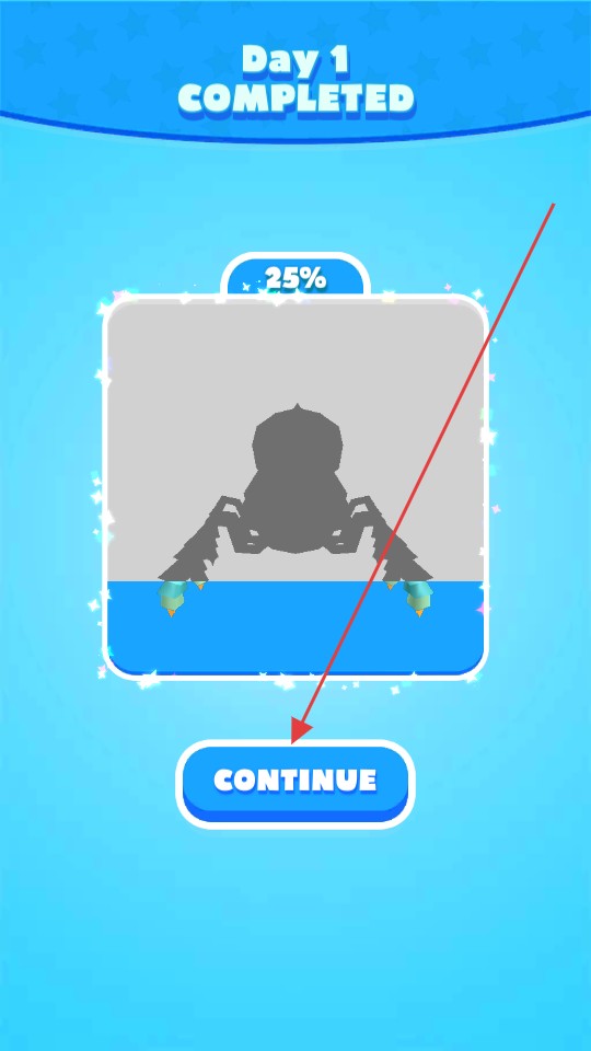 4、完成第一天的冒險后,界面顯示Day1COMPLETED,點擊下方的CONTINUE按鈕,繼續后續的游戲關卡,開啟新的冒險。