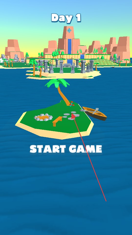 3、在顯示Day1的界面,點擊STARTGAME按鈕,進入第一天的島嶼冒險場景,開始在有小船、棕櫚樹的島嶼上探索。