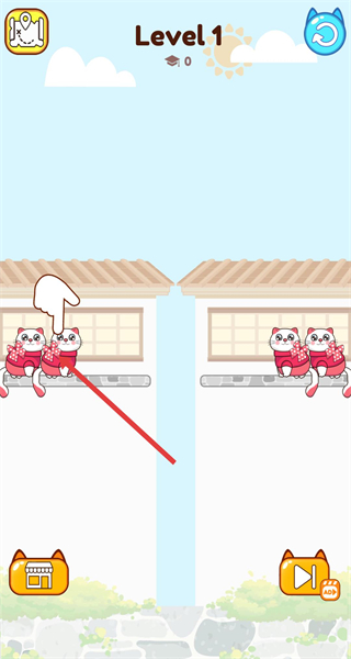 1、點擊左側穿粉衣的貓咪開啟配對挑戰,需觀察兩側貓咪裝扮通過點擊操作讓左右屋頂的貓咪分布逐步一致,完成初始關卡的對稱布局任務。