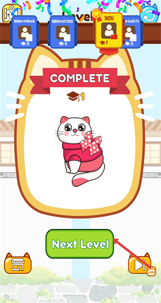2、成功通關Level1后,點擊綠色Next Level按鈕進入更高難度關卡,每關完成可積累進度,解鎖新的貓咪裝扮與布局挑戰持續推進游戲進程。