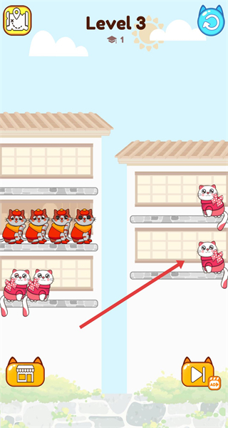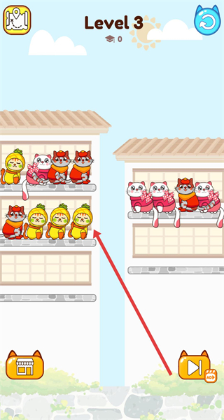 4、操作拖動或點擊貓咪如將左側粉衣貓移至右側對應位置,調整兩側貓咪的裝扮與數量讓左右屋頂布局對稱達成Level3的通關條件。