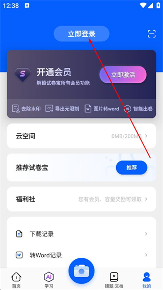 3、在我的頁面,點擊立即登錄按鈕,按應用流程完成登錄操作,登錄后可使用云空間、下載記錄、在線客服等功能,以及進行試卷拍攝、錯題收集等學習相關服務。