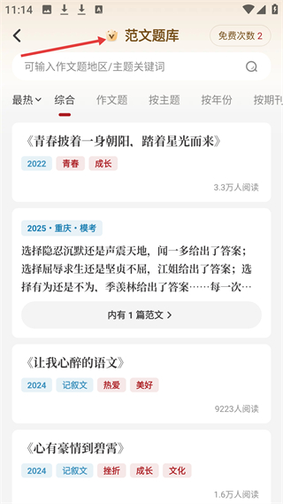 1、范文題庫可搜索不同地區、主題作文題,有青春披著一身朝陽,踏著星光而來等熱門范文助力寫作參考。
