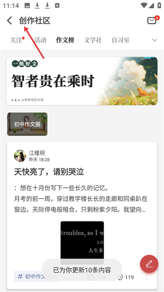 2、創作社區有作文榜、文學社等板塊,用戶分享作品,如天快亮了,請別哭泣,能互動交流,激發創作靈感。
