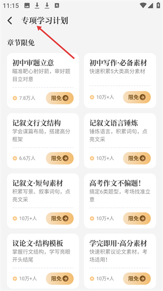 3、專項學習計劃含初中審題立意、寫作素材等限免課程,還有記敘文結構、議論文模板等內容,助力寫作能力提升。