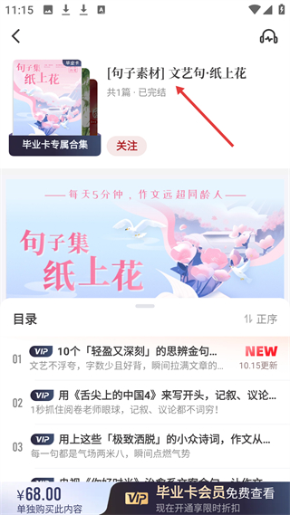 4、句子素材板塊有文藝句、紙上花合集,包含思辨金句等,畢業卡會員可免費查看,為作文增添文采。