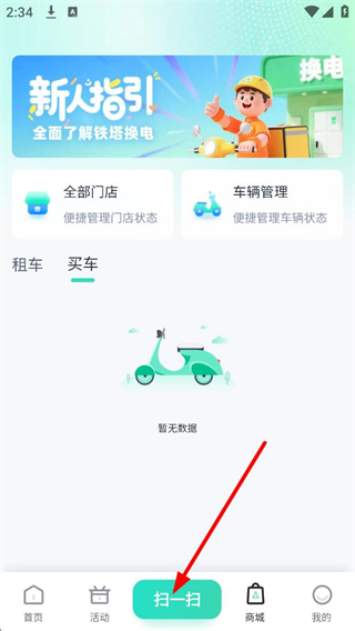 4、登錄后首頁有新人指引,還有全部門店、車輛管理等功能板塊,可點擊掃一掃,便捷開展換電等相關服務。