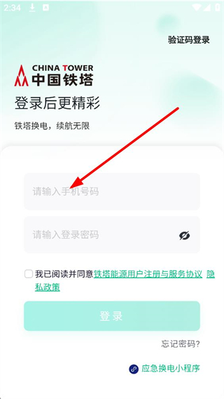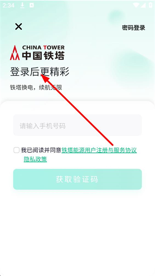 2、未登錄時會進入中國鐵塔登錄界面,可選擇驗證碼登錄或密碼登錄,按照提示輸入信息完成登錄,以便使用更多功能。