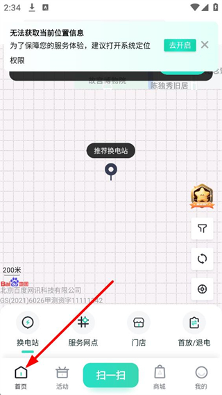 1、進入首頁可看到推薦換電站標識,下方有換電站、服務網點、門店等功能入口,還能點擊掃一掃,開啟換電相關操作。