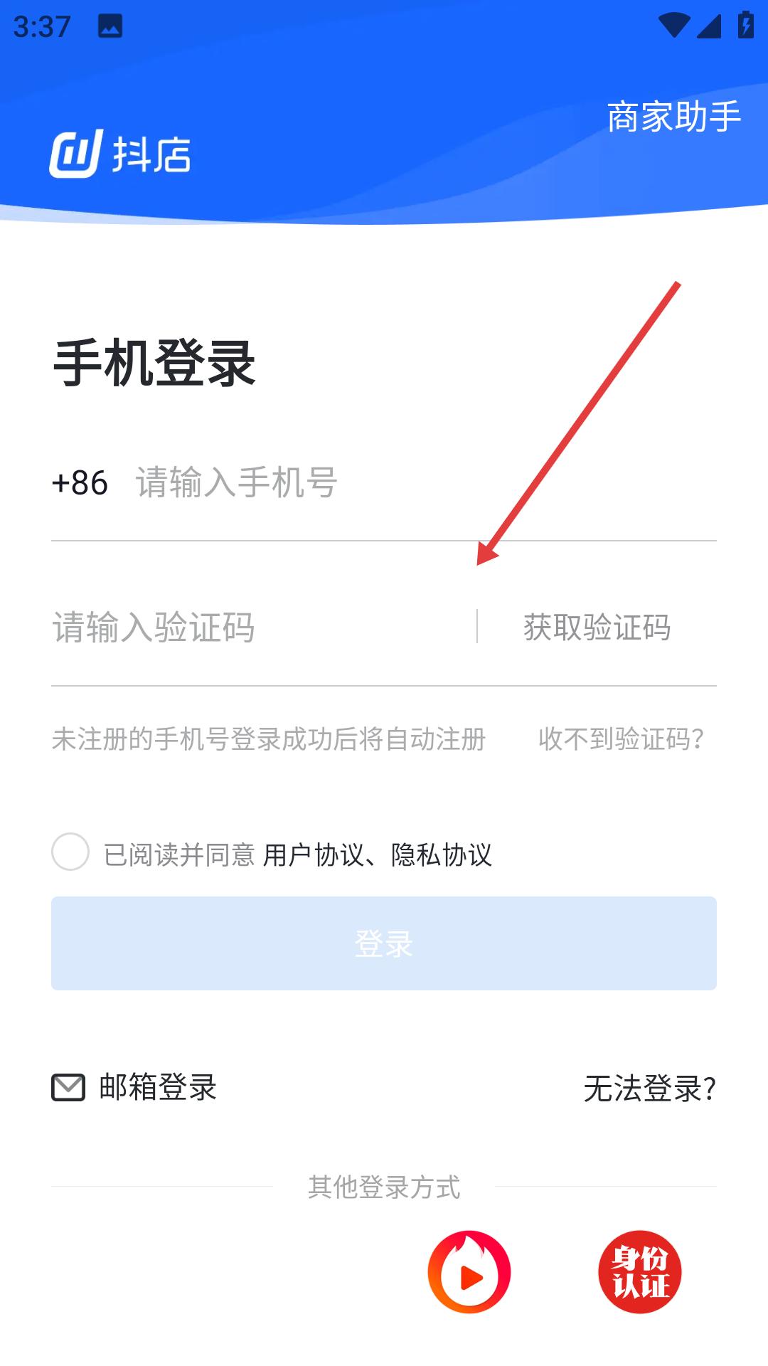 1、抖店手機登錄頁需填手機號、驗證碼,勾選協議后點登錄,也可切換郵箱或其他方式,未注冊手機號登錄即自動注冊。