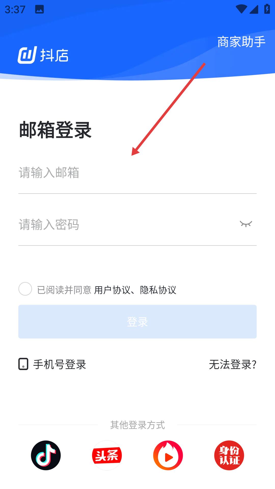 3、抖店郵箱登錄界面,需輸入郵箱、密碼,勾選協議點登錄,可切換手機號登錄,還有抖音、頭條等其他方式可選。