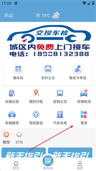 1、進入嘉州通APP首頁,可查看乘車碼、實時公交等功能,點擊更多可進入更多服務頁面。