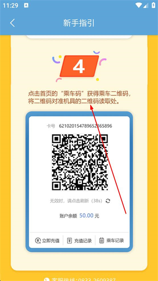 4、在新手指引頁面,可查看獲得乘車二維碼的步驟,點擊首頁乘車碼可生成乘車二維碼,用于乘車掃碼。